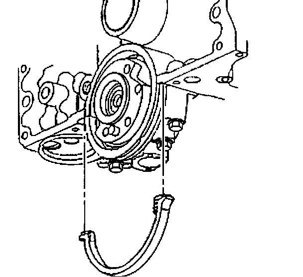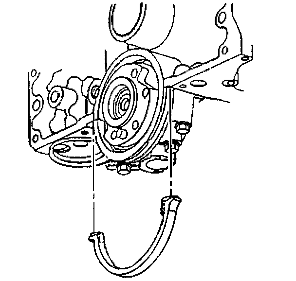 1. Apply a 2 mm (1/16 inch) bead of RTV sealant GM P/N 12346286 to the oil pan rear seal at the inside corners where the seal meets the rear main bearing cap on the block.