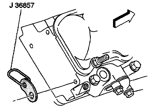 35. Install the J 36857 and a length of chain, using GM P/N 23503910 or equivalent attaching bolt to the right cylinder head rear corner and left cylinder head front corner.