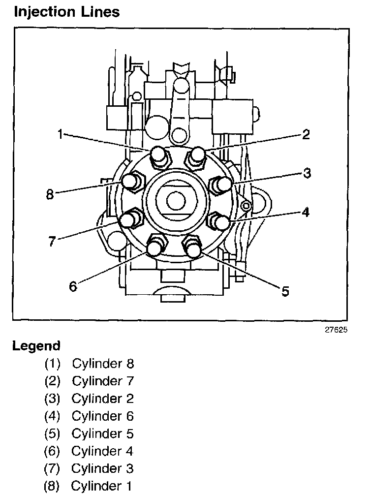 The injection lines connect the high pressure discharge fittings on the head of the injection pump to the injection nozzles. The injection lines are pre-bent for correct routing and connect to the injection pump head as shown in the figure above. The injection lines are equal in length and interior volume.
