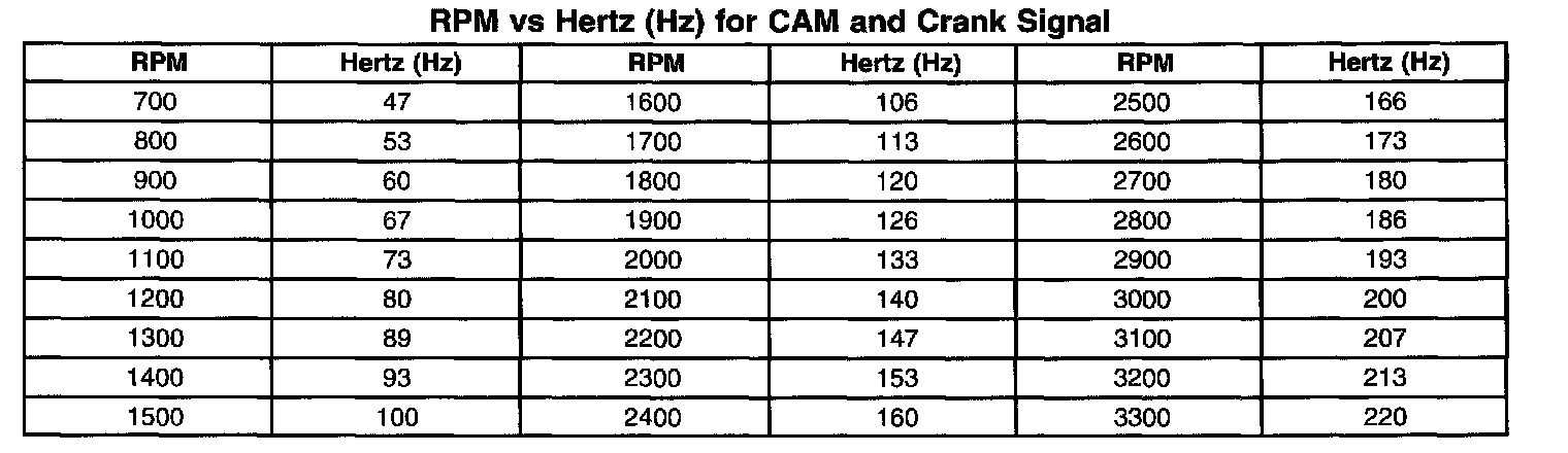 RPM Vs Hertz (Hz) For Cam And Crank Signal:
