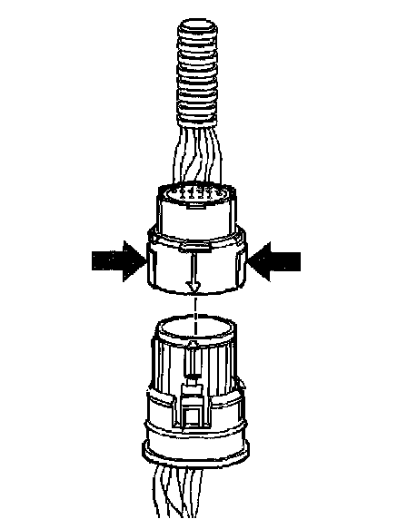 ^ In order to reinstall the external wiring connector, first orient the pins by lining up the arrows on each half of the connector. Push the connector straight down into the transmission without twisting or angling the mating parts.