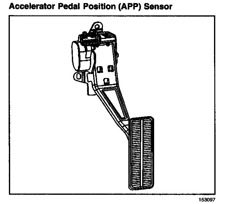 The APP sensor is mounted on the accelerator pedal assembly. The APP is actually 3 individual accelerator pedal position sensors within one housing. Three separate signal, low reference, and 5-volt reference circuits are used to connect the APP and the TAC module. The APP sensor 1 voltage should increase as the accelerator pedal is depressed, from below 1.0 volt at 0 pedal travel to above 2.0 volts at 100 percent pedal travel. APP sensor 2 voltage should decrease from above 4.0 volts at 0 pedal travel to below 2.9 volts at 100 percent pedal travel. APP sensor 3 voltage should decrease from above 3.8 volts at 0 percent pedal travel to below 3.1 volts at 100 percent pedal travel.