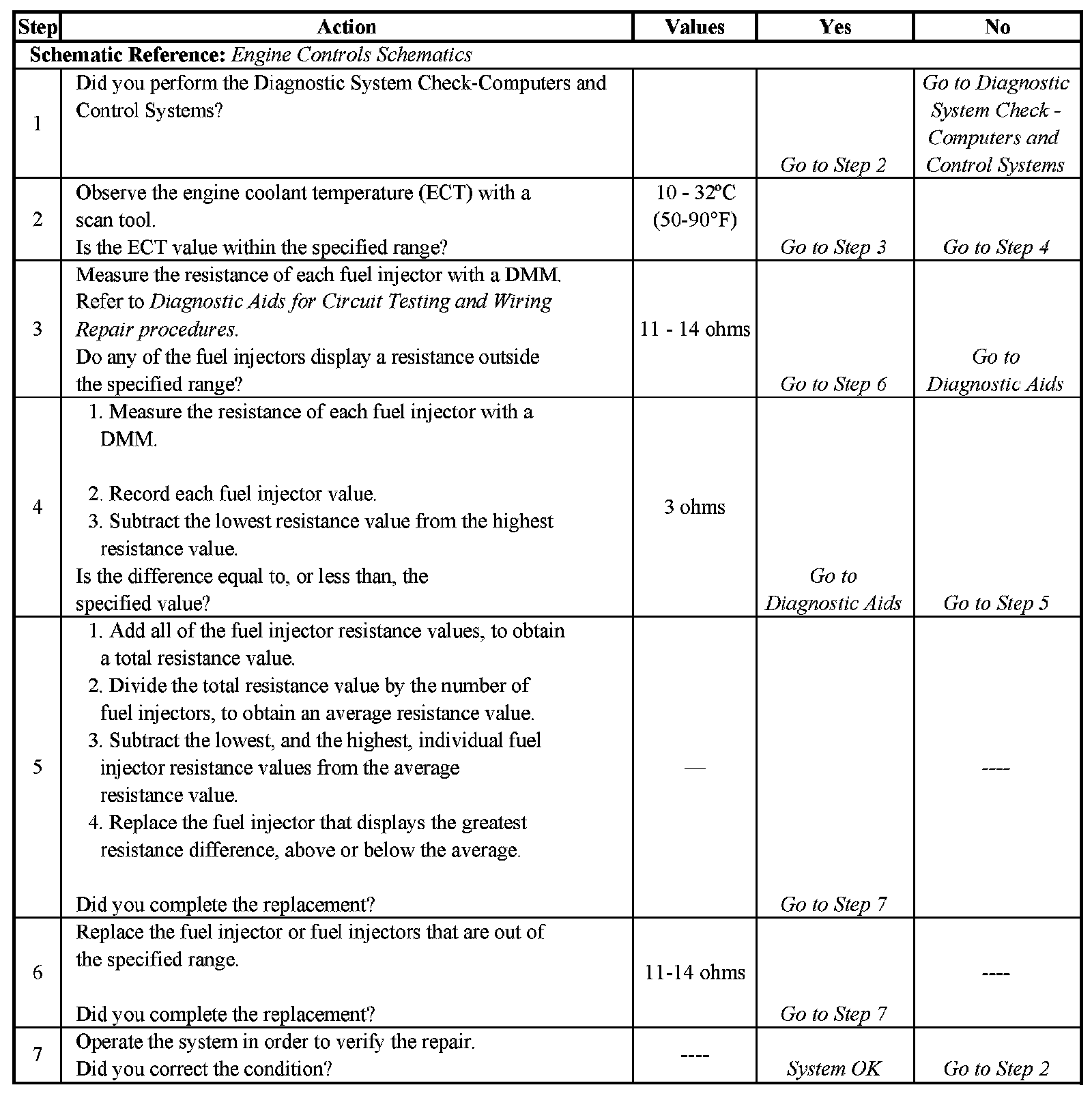 3. This step tests each fuel injector resistance within a specific temperature range. If any of the fuel injectors display a resistance outside of the specified value, replace the fuel injector.