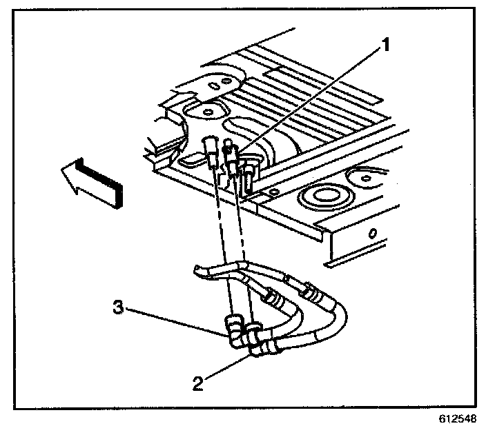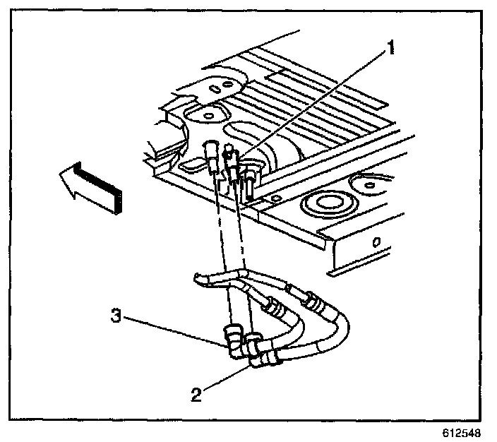 15. Install the heater lines (2,3) to the auxiliary HVAC module at the underside of vehicle.