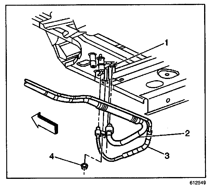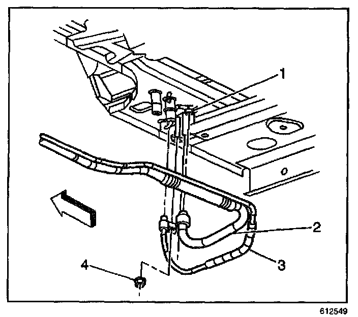 4. Disconnect the heater lines (2,3) from the auxiliary HVAC module at the underside of the vehicle.
