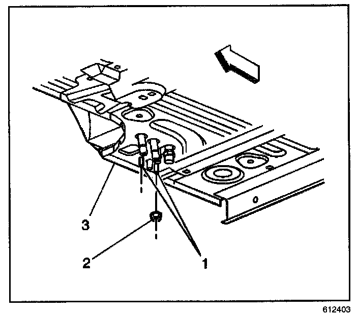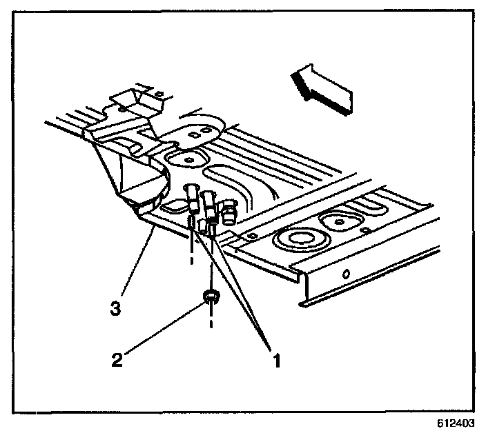 6. Remove the nuts (2) from the studs (1) that secure the auxiliary HVAC module to the underside of the vehicle.
