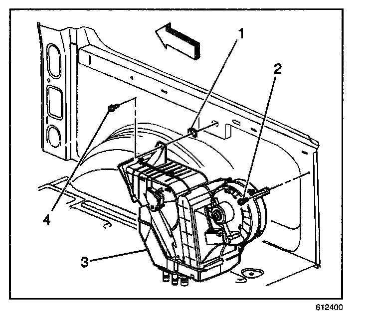 16. Remove the fasteners (2,4) retaining the auxiliary HVAC module to the vehicle.