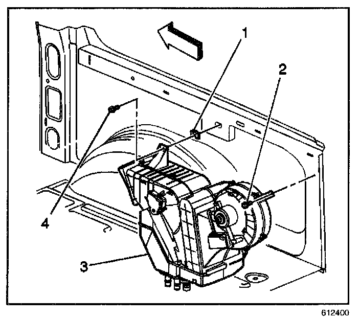 2. Install the two bolts (2,4) inside the vehicle in order to retain the auxiliary HVAC module to the vehicle.