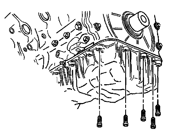 7. Install the 5 bolts retaining the upper oil pan to the engine front cover.
