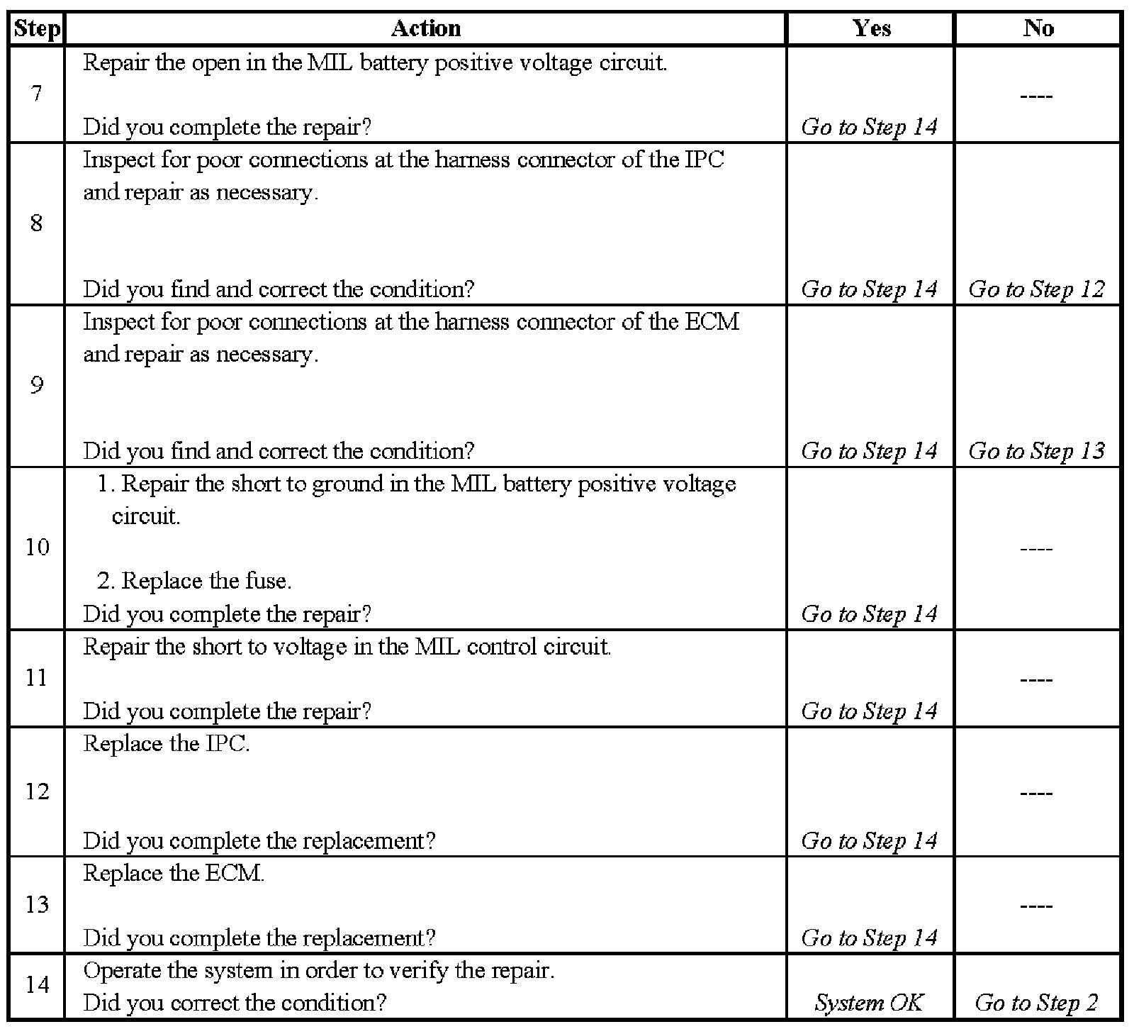 Malfunction Indicator Lamp (MIL) Inoperative - Steps 7-14: