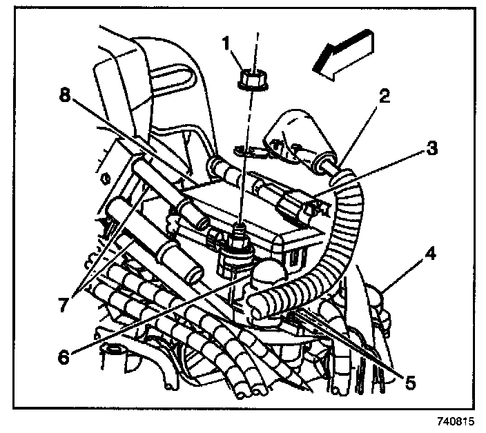 6. Install the battery supply wiring harness nut (1) and harness connector (2) on the glow plug relay (8).