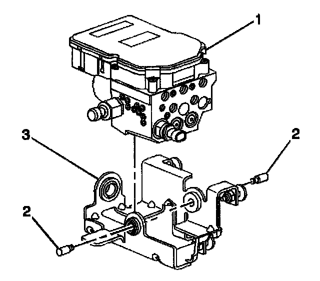2. Remove the bolts (2) that secure the Brake Pressure Modulator Valve (BPMV) (1) to the mounting bracket (3).