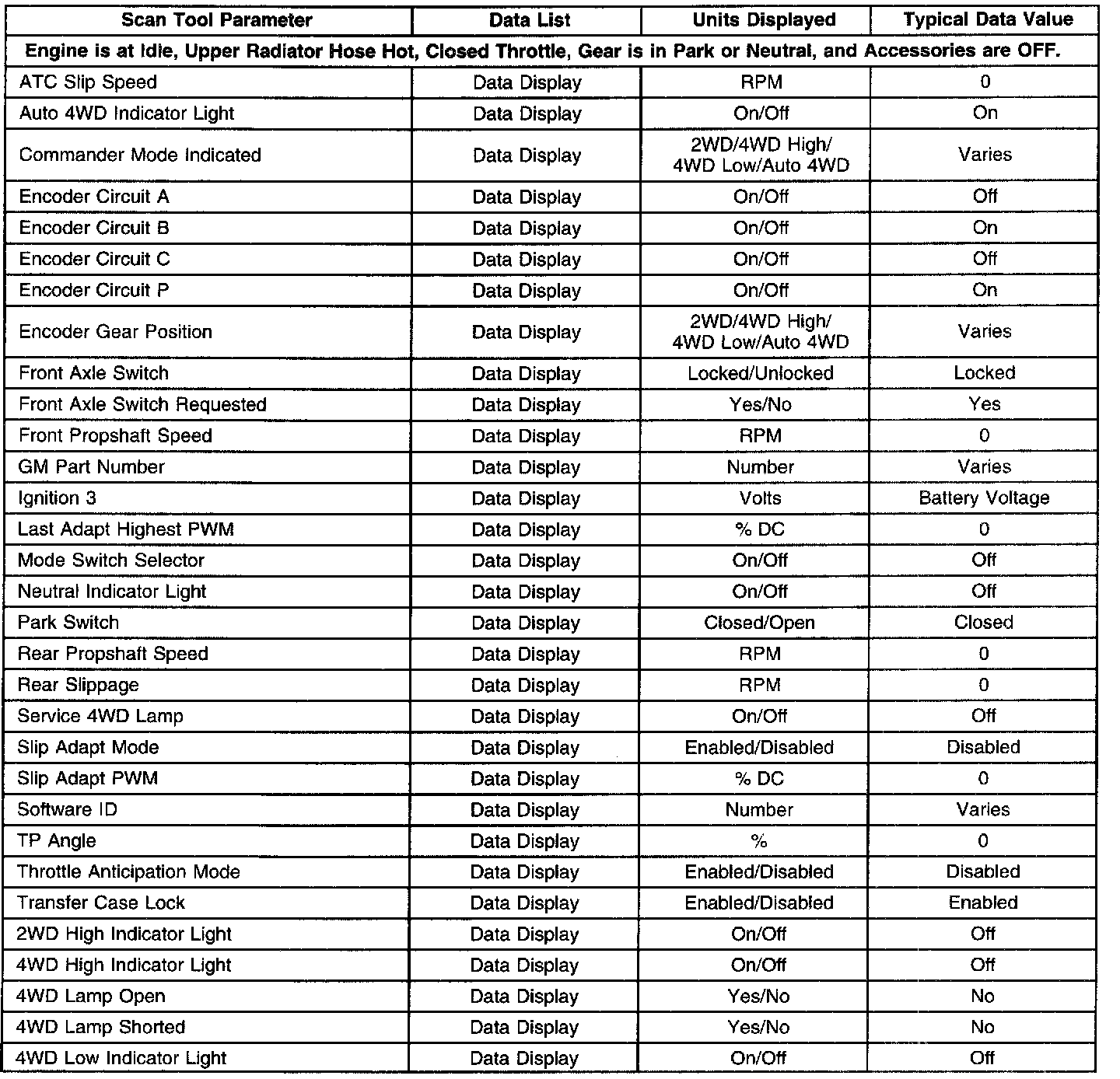Scan tool values from a properly operating system may be used for comparison with the transfer case system you are diagnosing. The Transfer Case Scan Tool Data List represents values recorded under the following conditions: