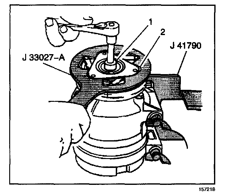 3. Hold the clutch hub and drive plate assembly (2) in place using the J 33027-A.