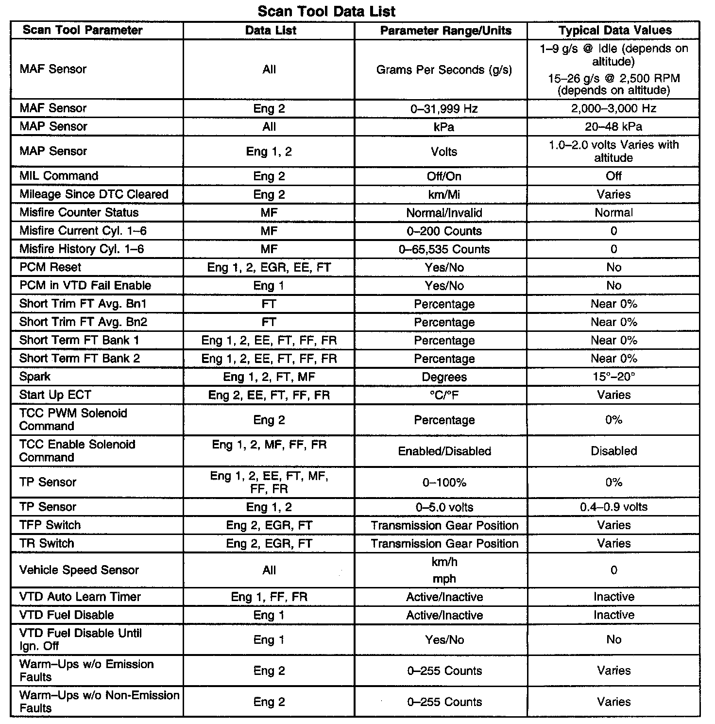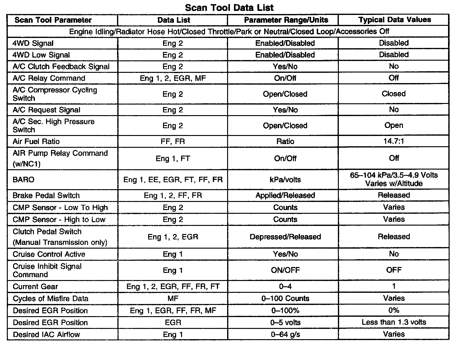 The Engine Scan Tool Data List contains all engine related parameters that are available on the scan tool. The list is arranged in alphabetical order. A given parameter may appear in any one of the data lists, and in some cases may appear more than once, or in more than one data list in order to group certain related parameters together.