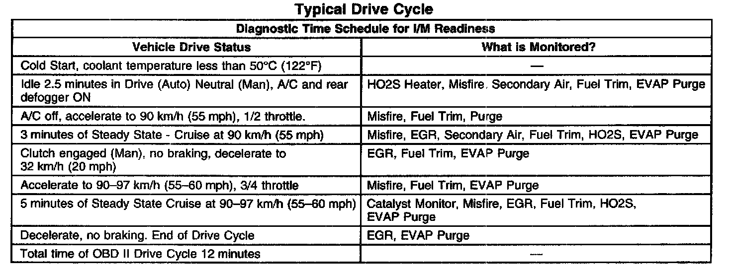 IMPORTANT: The System Status display indicates only whether or not the test has been completed. The System Status display does not necessarily mean that the test has passed. If a Failed Last Test indication is present for a DTC associated with one of the above systems, diagnosis and repair is necessary in order to meet the I/M requirement. Verify that the vehicle passes all of the diagnostic tests associated with the displayed System Status prior to returning the vehicle to the customer. Refer to the Typical Drive Cycle table, more than one drive cycle may be needed, to use as a guide to complete the I/M System Status tests.