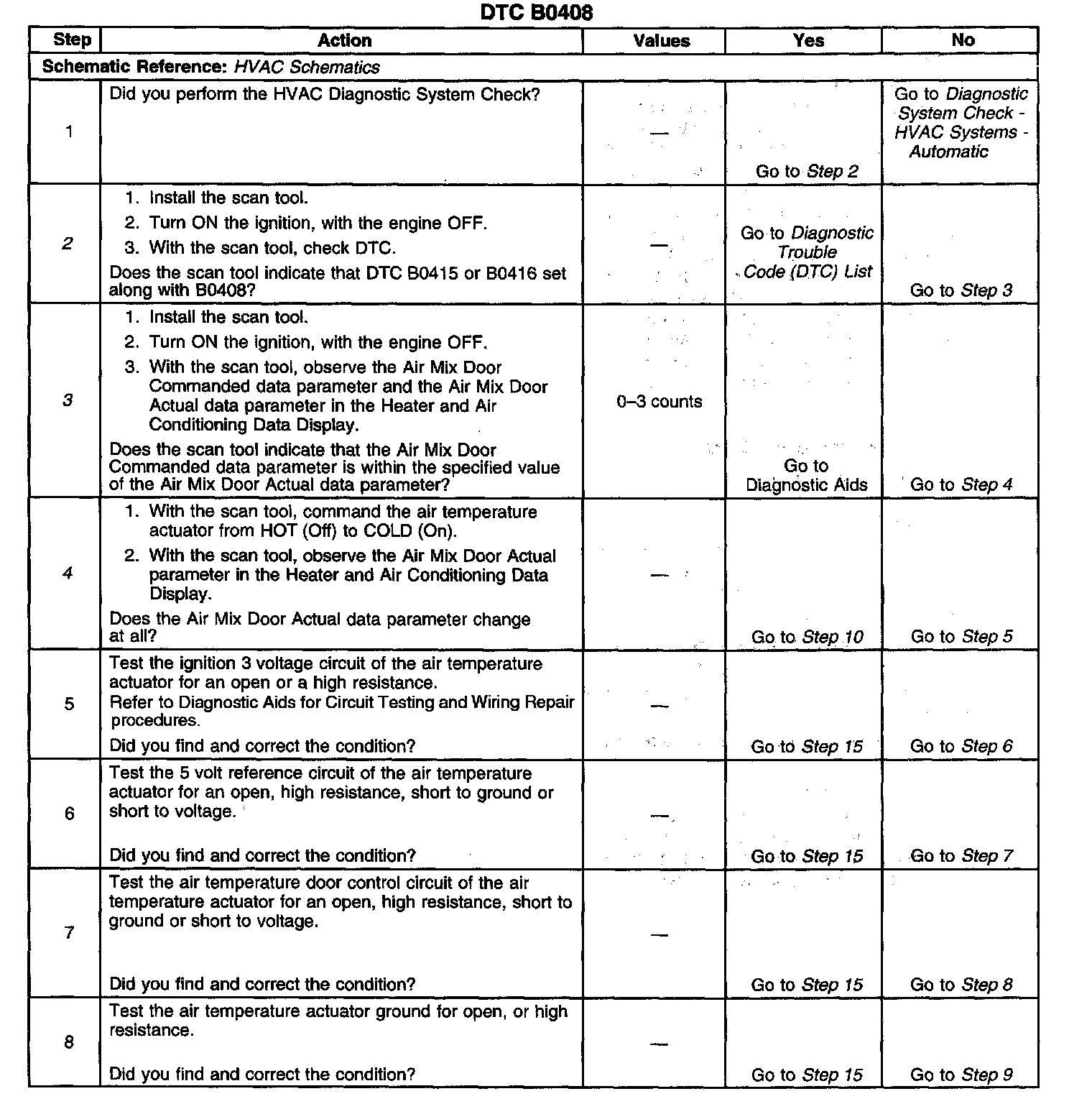 CIRCUIT DESCRIPTIONThe HVAC control module receives a position signal from the air temperature actuator. The air temperature actuator position sensor Is a potentiometer that is tied to a 5 volt reference source. The variable output from the potentiometer feeds back a position signal to a pull-up resistor which Is located In the HVAC control module. This signal determines the necessary drive signal to the actuator motor which provides the proper air temperature door position. This value is stored in the keep alive memory (KAM) portion of the HVAC control module. When the air temperature door is in a full hot position the scan tool will read above 190 counts. When the air temperature door is in full cold position the scan tool will read below 48 counts. Normal operating range is 46 counts to 200 counts.