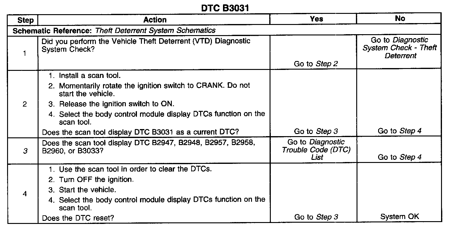 3. Tests for the proper operation of the 12 V reference Security Sensor Power circuit, sensor ground circuit, and Passlock(TM) sensor signal (data) circuit. Troubleshoot the appropriate DTC prior to diagnosing DTC B3031.