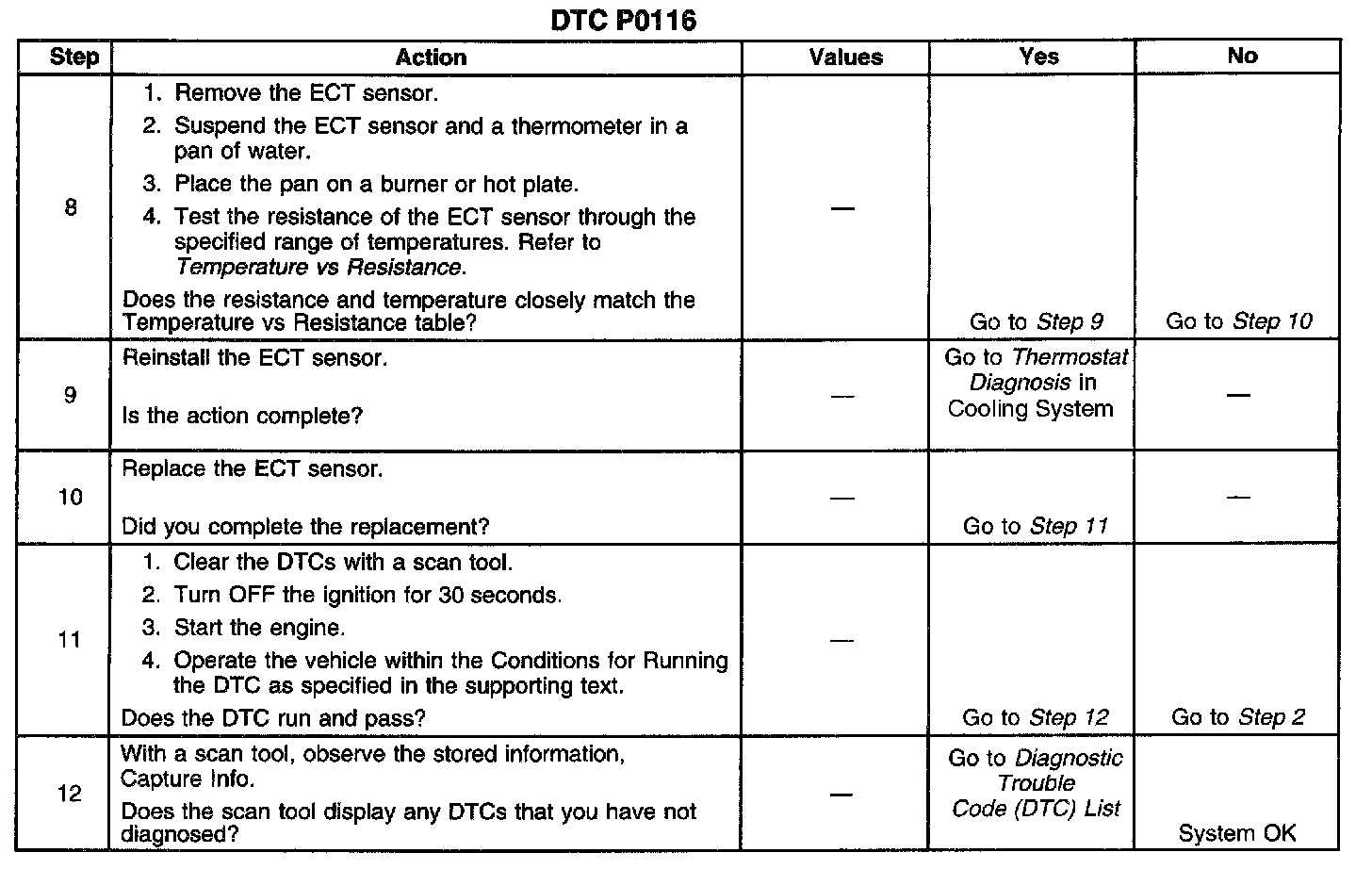 ^ When checking the ECT sensor, the Temperature vs Resistance table should be used in order to determine if a skewed sensor is the problem.