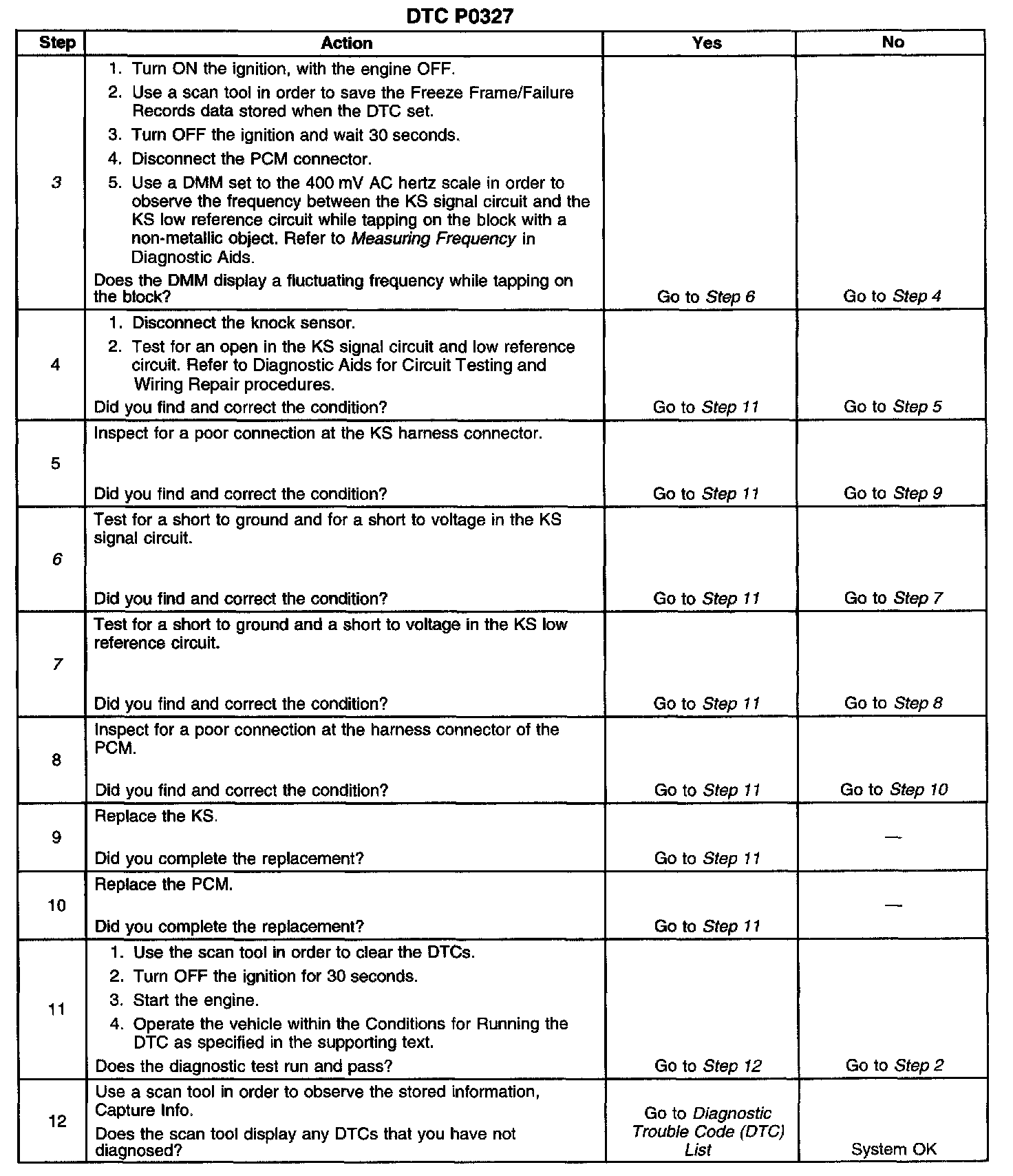 CIRCUIT DESCRIPTIONThe knock sensor (KS) produces an AC voltage at all engine speeds and loads. The powertrain control module (PCM) then adjusts the spark timing based on the amplitude and frequency of the KS signal. The PCM uses the KS signal to calculate the average voltage. Then the PCM assigns a voltage value. The PCM checks the KS and related wiring by comparing the actual knock signal to the assigned voltage range. A normal KS signal should stay within the assigned voltage range. This (DTC) will set if the KS signal is outside the assigned voltage range or not present.