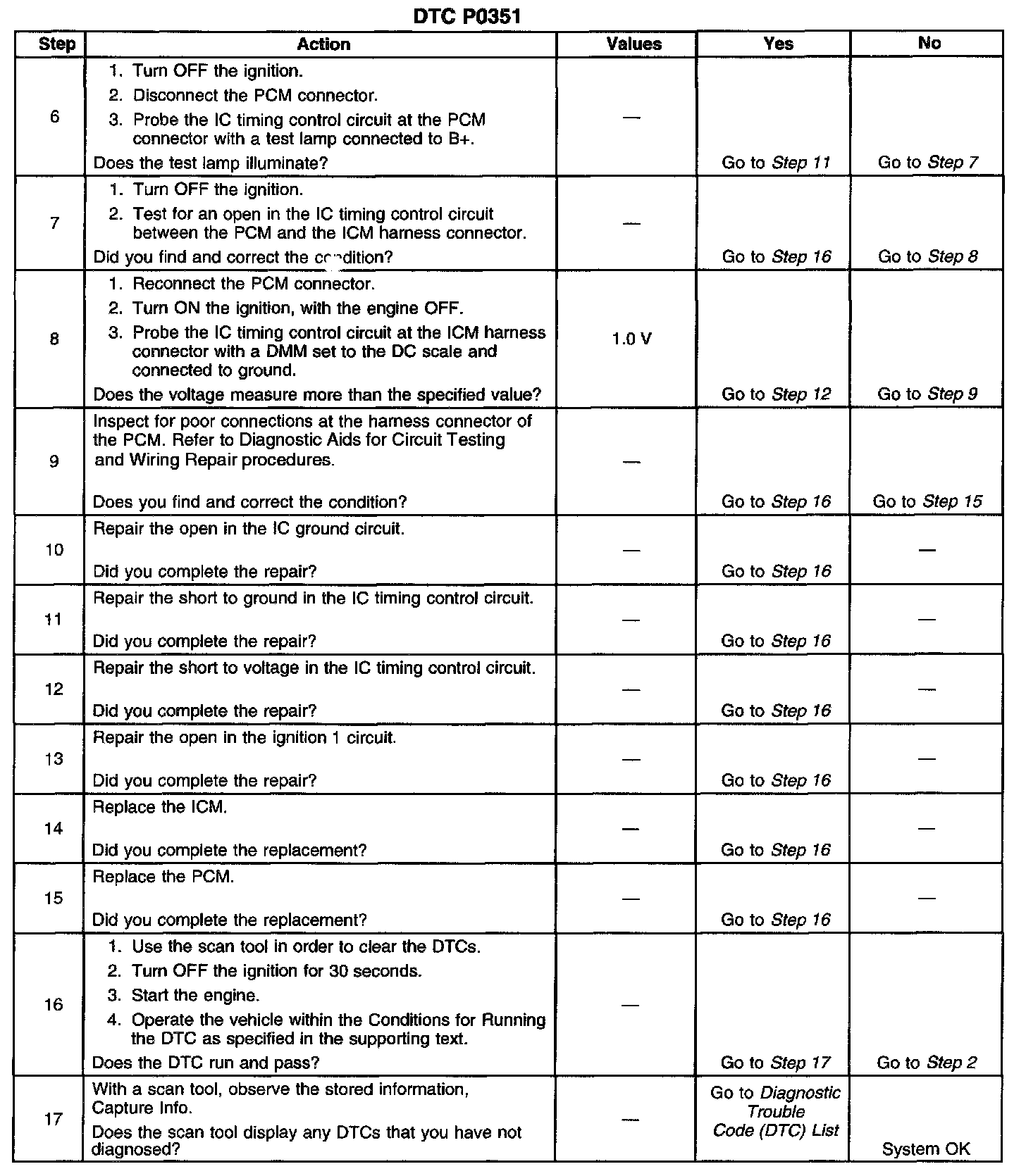 CIRCUIT DESCRIPTIONThe enhanced ignition system uses the crankshaft position (CKP) sensor in order to provide a timing input to the control module. Ignition control (IC) spark timing for each cylinder is based on this input. The control module provides the ignition timing signal to the ignition control module (ICM) to control the ignition coil. Each timing pulse detected by the ICM allows the ICM to energize the ignition coil. A large secondary ignition voltage is induced in the secondary coil by the primary coil. This high voltage is switched to the correct spark plug by the distributor. This diagnostic trouble code (DTC) will set if the powertrain control module (PCM) detects an unusually high or low voltage on the ignition timing signal circuit.