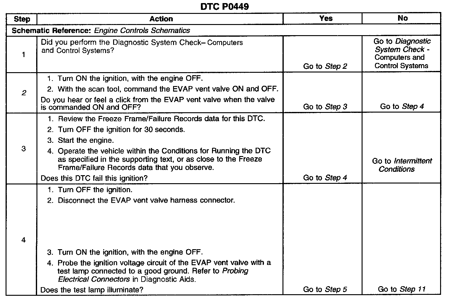 CIRCUIT DESCRIPTIONAn ignition voltage is supplied directly to the evaporative emissions (EVAP) vent valve. The control module controls the EVAP vent valve by grounding the control circuit via an internal switch called a driver. The primary function of the driver is to supply the ground for the controlled component. The control module monitors the status of the driver. If the control module detects an incorrect voltage for the commanded state of the driver DTC P0449 sets.