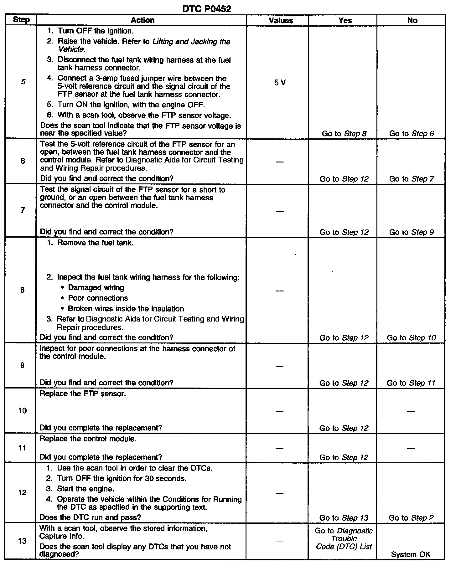 CIRCUIT DESCRIPTIONThe control module monitors the fuel tank pressure (FTP) sensor signal in order to detect vacuum decay and excess vacuum during the enhanced evaporative emission (EVAP) diagnostic. The control module supplies a 5-volt reference and ground to the sensor. The FTP sensor signal voltage increases as the FTP decreases, negative pressure or vacuum, high voltage. The FTP sensor signal voltage decreases as the FTP increases, positive pressure, low voltage. This diagnostic trouble code (DTC) sets when the FTP sensor signal goes below a predetermined value.