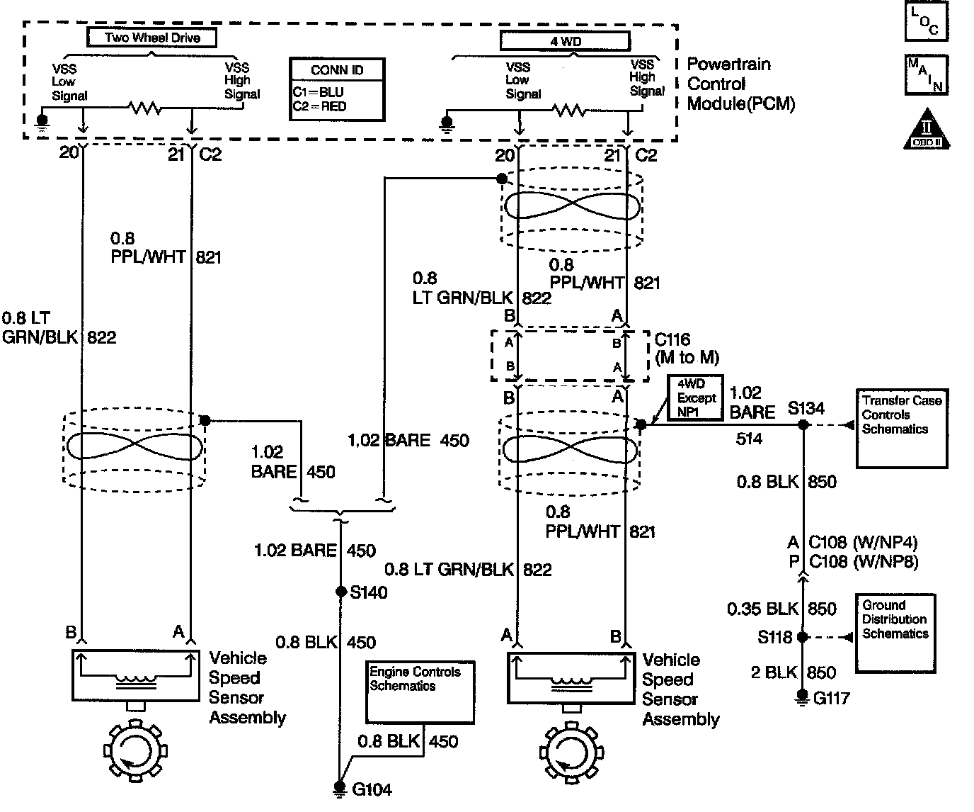 The vehicle speed sensor (VSS) assembly provides vehicle speed information to the powertrain control module (PCM). The VSS assembly is a permanent magnet generator. The VSS produces alternating current (AC) as the rotor teeth on the output shaft of the transmission (2WD) or transfer case (4WD) pass through the sensor's magnetic field. The frequency and amplitude of the AC waveform both increase as vehicle speed increases.