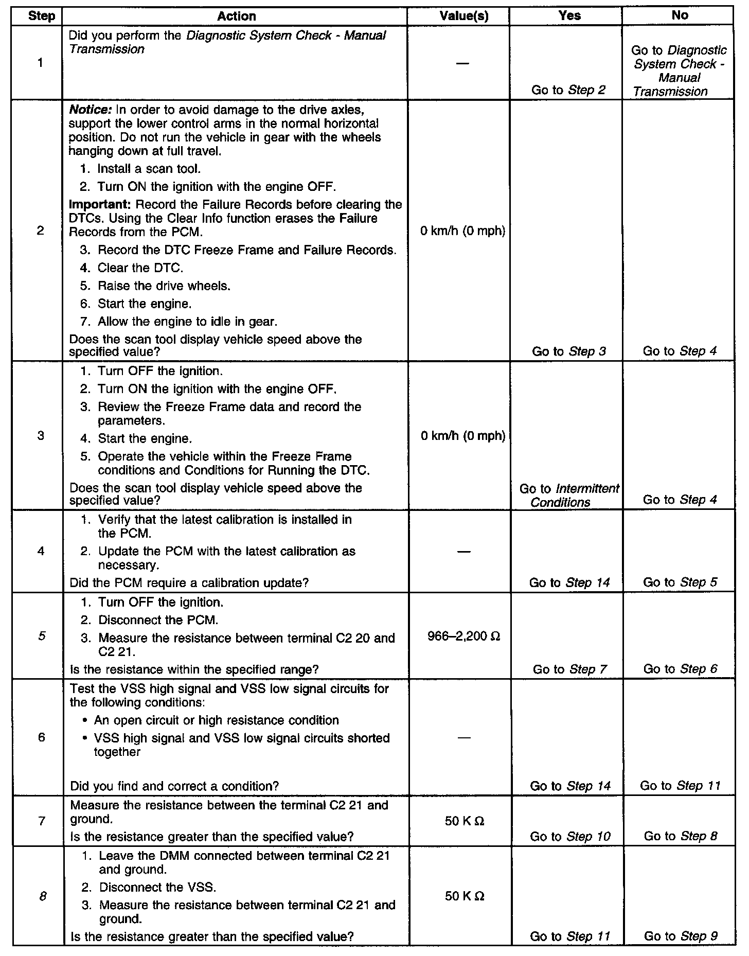 5. The resistance measurement will not change if either the VSS high signal circuit or the VSS low signal circuit, but not both, is shorted to ground. The vehicle speed detector in the PCM and the VSS are matched in such a way that an open or a short to ground in the VSS low signal circuit will not usually cause a loss of speed signal or a DTC P0500 to set. The lower resistance value given represents the nominal resistance specification of the VSS at -40°C (-40°F), minus the manufacturing tolerance specification of 10 percent. The higher resistance value given represents the nominal resistance specification of the VSS at 150°C (302°F), plus the manufacturing tolerance specification of 10 percent.