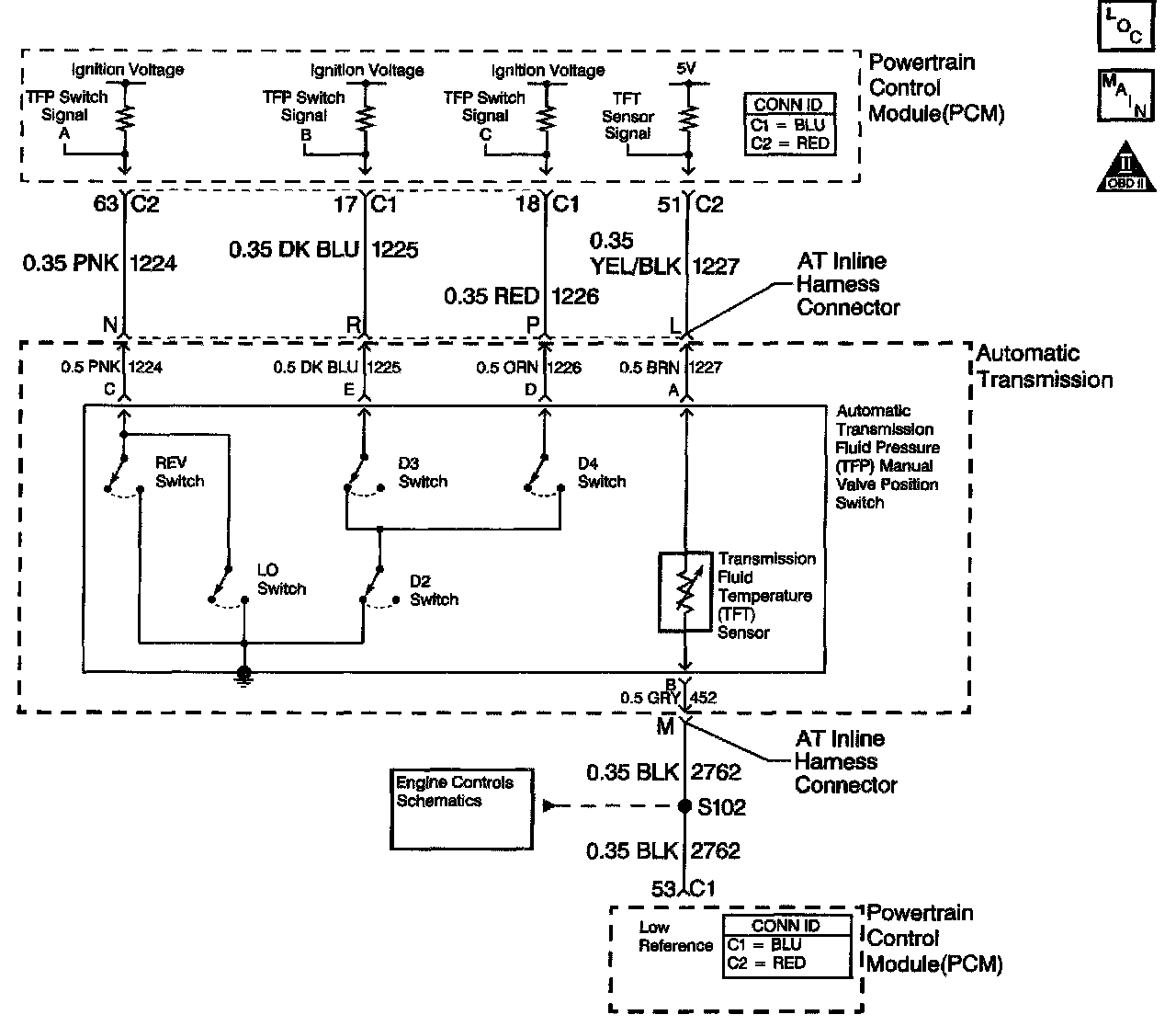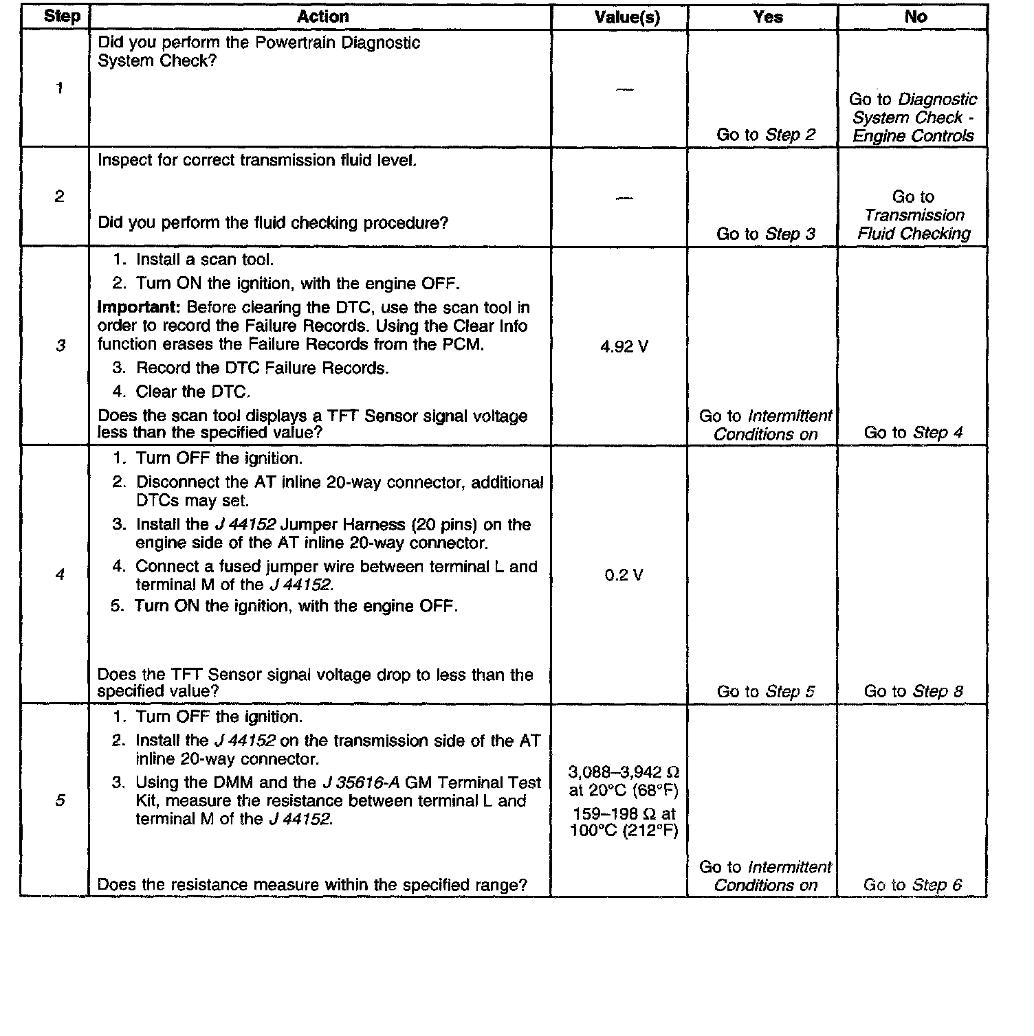 The automatic transmission fluid temperature (TFT) sensor is part of the automatic transmission fluid pressure (TFP) manual valve position switch. The TFT sensor is a resistor, or thermistor, which changes value based on temperature. The sensor has a negative-temperature coefficient. This means that as the temperature increases, the resistance decreases, and as the temperature decreases, the resistance increases. The powertrain control module (PCM) supplies a 5-volt reference signal to the sensor on the TFT sensor signal circuit and measures the voltage drop in the circuit. When the transmission fluid is cold, the sensor resistance is high and the PCM detects high signal voltage. As the fluid temperature warms to a normal operating temperature, the resistance becomes less and the signal voltage decreases. The PCM uses this information to control shift quality and torque converter clutch apply.
