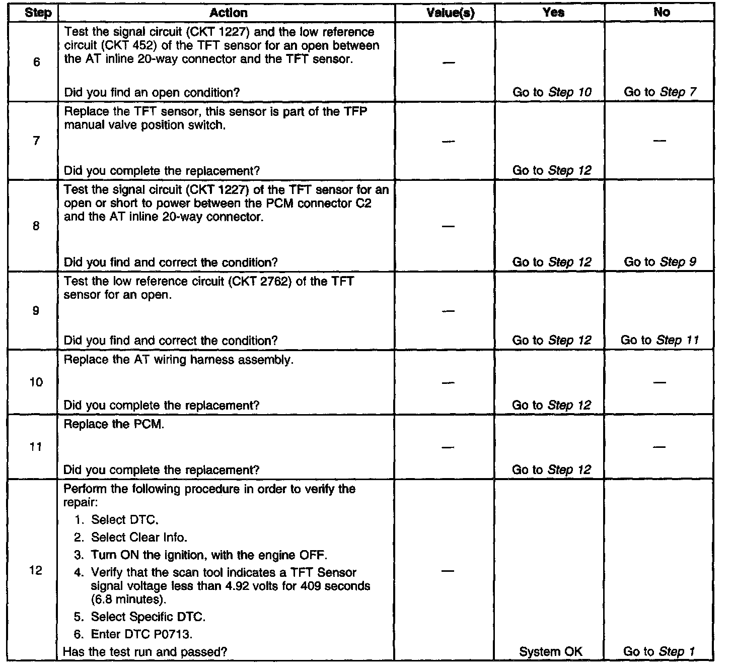 When the PCM detects a continuous open or short to power in the TFT signal circuit or the TFT sensor, then DTC P0713 sets. DTC P0713 is a type C DTC.