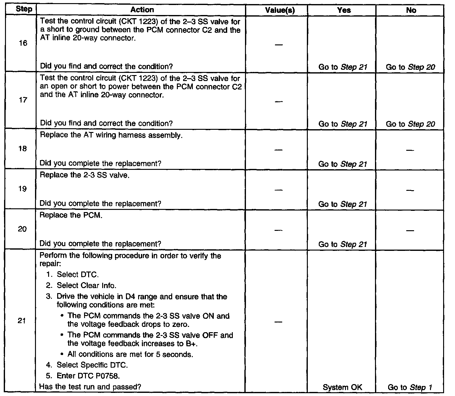 The 2-3 shift solenoid (SS) valve controls the fluid flow acting on the 2-3 shift valves. The 2-3 SS valve is a normally-open exhaust valve that is used with the 1-2 SS valve in order to allow four different shifting combinations. The solenoid attaches to the control valve body within the transmission. The 2-3 SS valve receives ignition voltage through the OFF/ON/START voltage circuit. The powertrain control module (PCM) controls the solenoid by providing the ground path on the 2-3 shift solenoid valve control circuit. When the PCM detects a continuous open or short to ground in the 2-3 SS valve circuit or the 2-3 SS valve, then DTC P0758 sets. DTC P0758 is a type A DTC.
