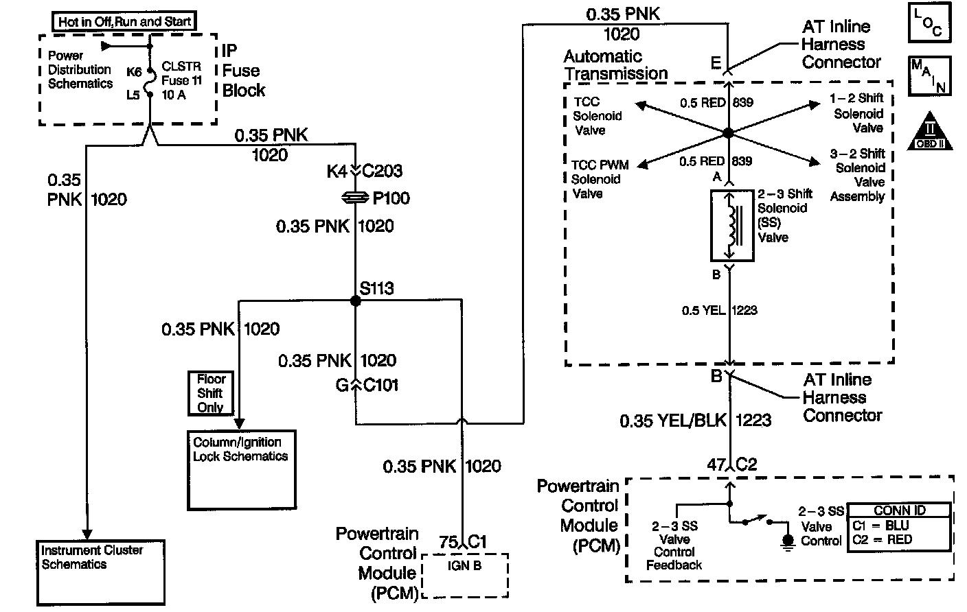 The 2-3 shift solenoid (SS) valve controls the fluid flow acting on the 2-3 shift valves. The solenoid is a normally open exhaust valve. With the 1-2 SS valve, the 2-3 SS valve allows four different shifting combinations. The solenoid attaches to the control valve body within the transmission. The 2-3 SS valve receives ignition voltage through the OFF/ON/START voltage circuit. The powertrain control module (PCM) controls the solenoid by providing the ground path on the 2-3 SS valve control circuit.