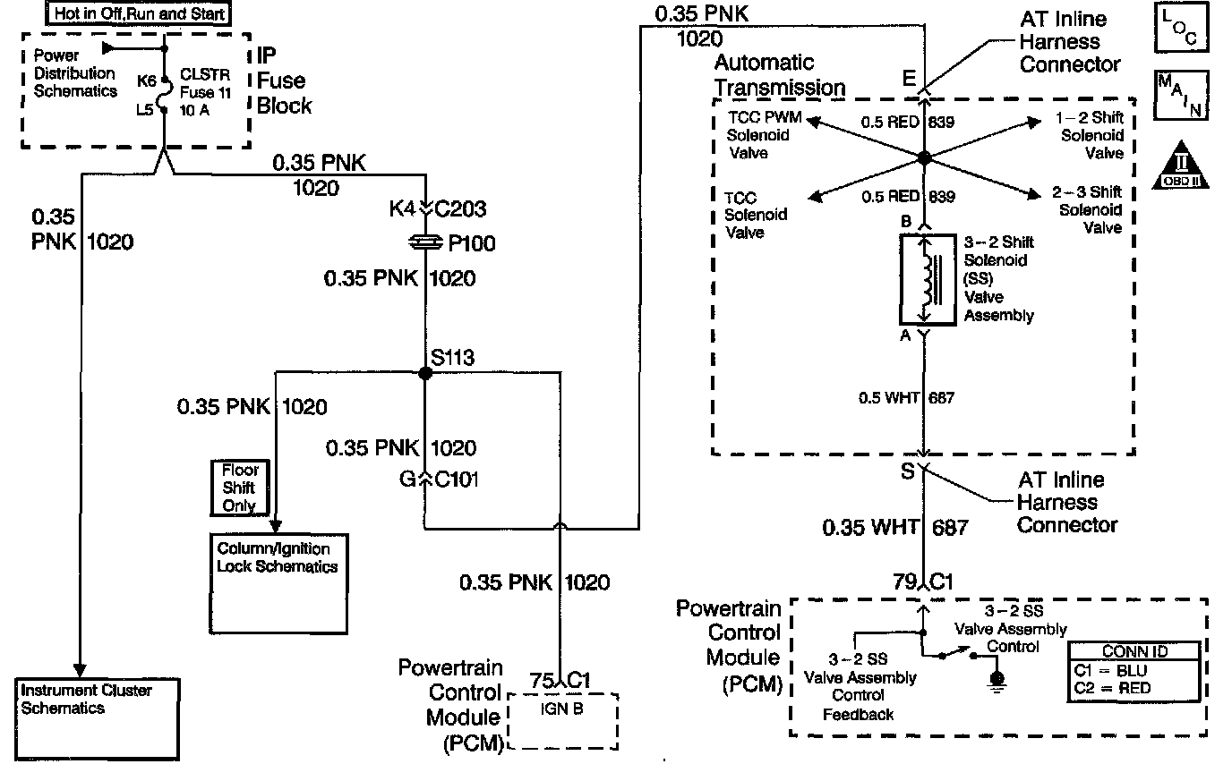 The 3-2 shift solenoid (SS) valve assembly is a normally-closed, 3-port, on/off device that controls the 3-2 downshift. The solenoid attaches to the control valve body within the transmission. The solenoid receives ignition voltage through the OFF/ON/START voltage circuit. The powertrain control module (PCM) controls the solenoid by providing a ground path on the 3-2 shift solenoid valve control circuit. During a 3-2 downshift, the 2-4 band applies as the 3-4 clutch releases. The PCM varies the timing between the 3-4 clutch release and the 2-4 band apply, depending on the vehicle speed and the throttle position.
