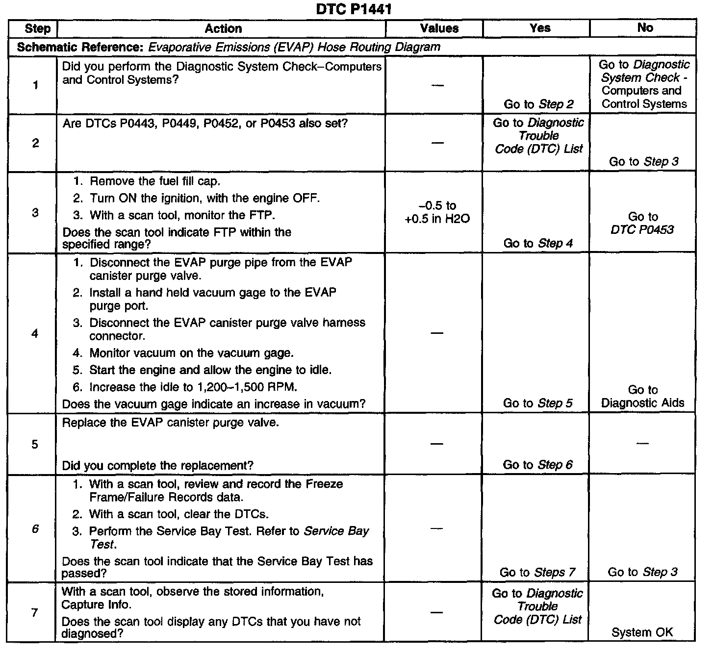 DESCRIPTIONThis diagnostic trouble code (DTC) tests for undesired intake manifold vacuum flow to the evaporative emission (EVAP) system. The control module seals the EVAP system by commanding the EVAP purge valve OFF, closed, and the EVAP vent valve ON, closed. The control module monitors the fuel tank pressure (FTP) sensor to determine if a vacuum is being drawn on the EVAP system. If the vacuum in the EVAP system is more than a calibrated value within a calibrated time, DTC P1441 will set.