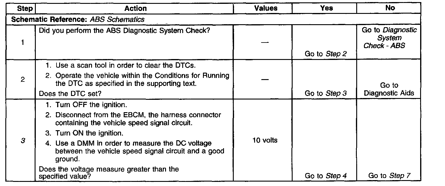 ^ After the DTC; is cleared and the ignition is ON, the ABS indicator may remain ON until the EBCM completes a power-up self-test. This test concludes when the vehicle reaches a speed greater than 13 km/h (8 mph) and the wheel speeds are verified by the EBCM.