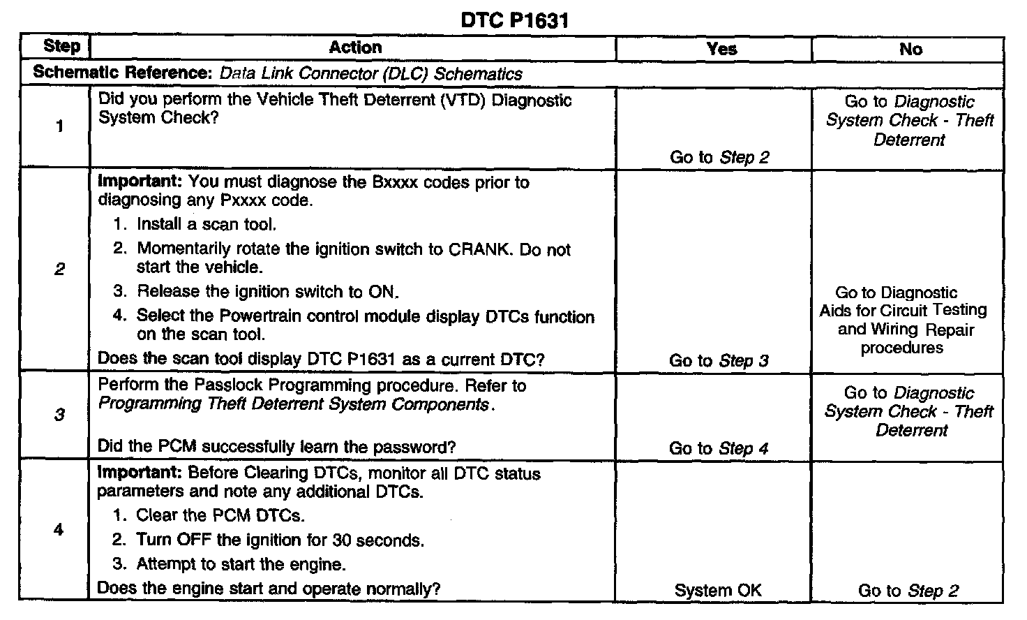 When the passlock portion of the VTD system has sensed the proper operation of the ignition switch and lock, or determined that the switch and lock have not been tampered with, the BCM transmits a password to the PCM. Fuel delivery is enabled if this password matches the password stored in the modules memory. If a component in the theft deterrent system has been replaced, the modules need to relearn the password of the new components. If the relearn procedure was not performed, this diagnostic trouble code (DTC) will set.