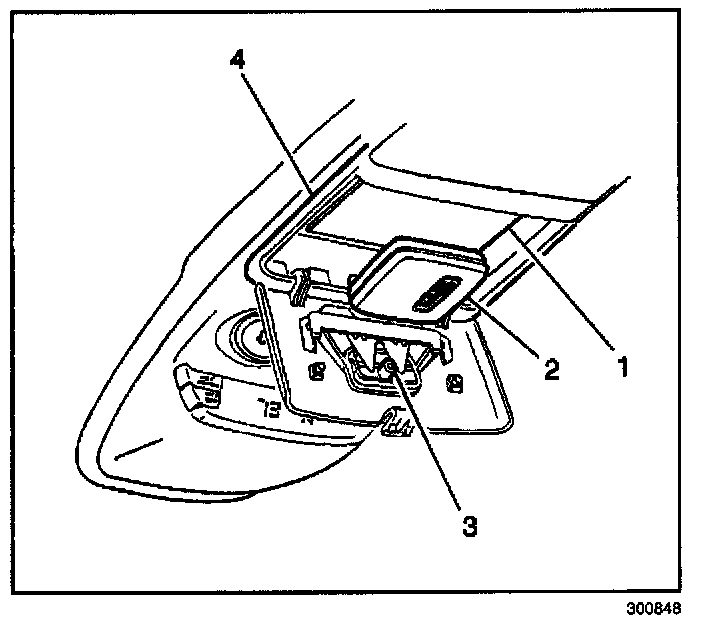 The overhead console (4) on some models provides a location for installing a garage door opener transmitter (2). Use the following procedure in order to install a transmitter.