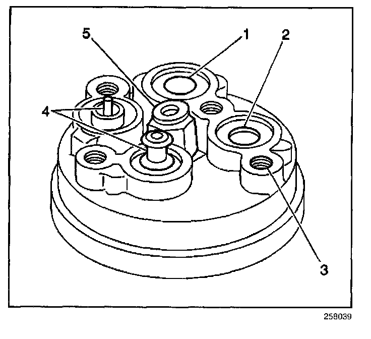 2. Connect the J 43600 low side and high side lines to the corresponding fittings on the J 39893. The suction port (1) (low-side) of the compressor has a large internal opening. The discharge port (high-side) has a smaller internal opening into the compressor. The discharge port (2) (high-side) also has a deeper recess.