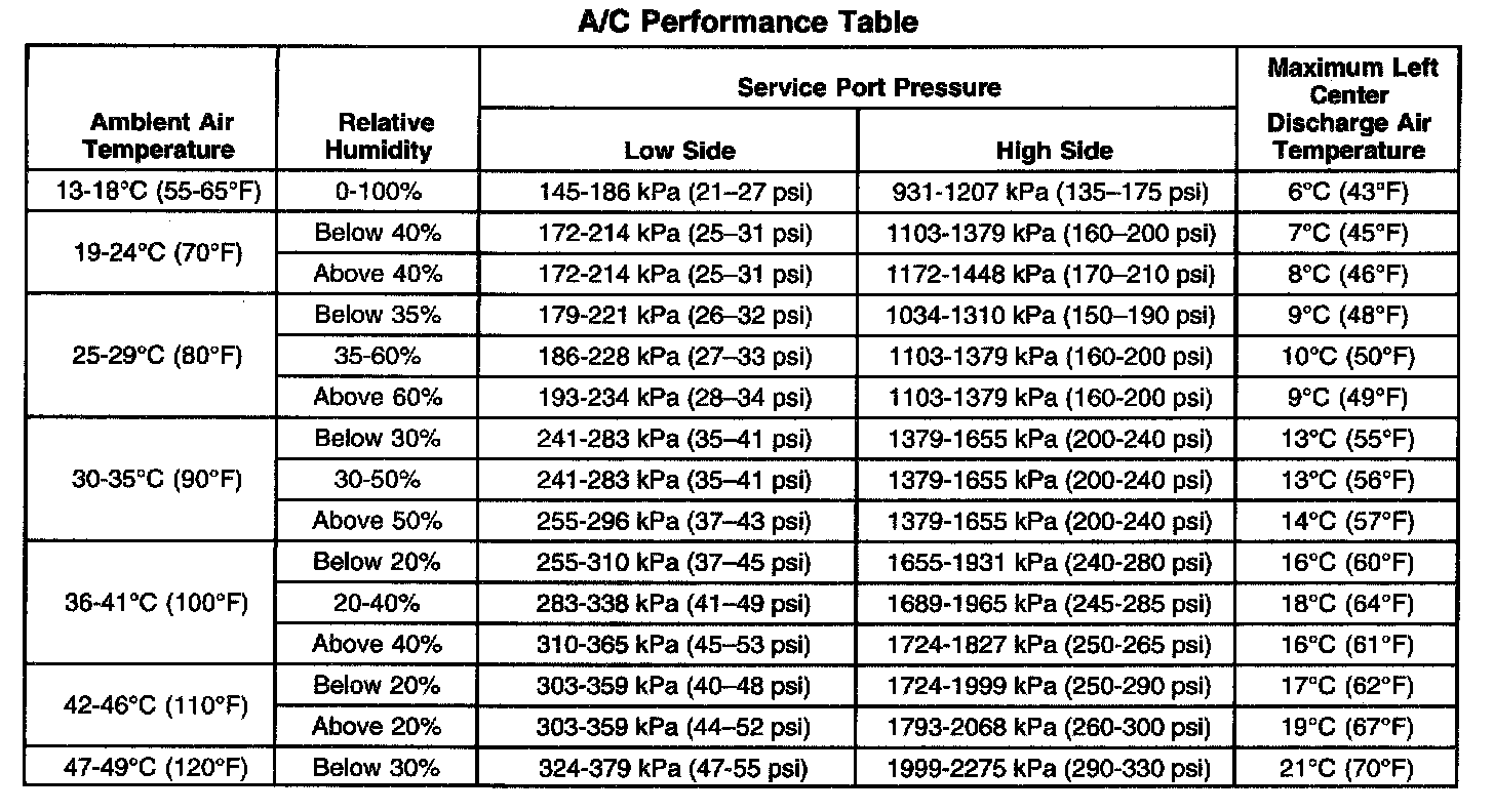 A/C Performance Table: