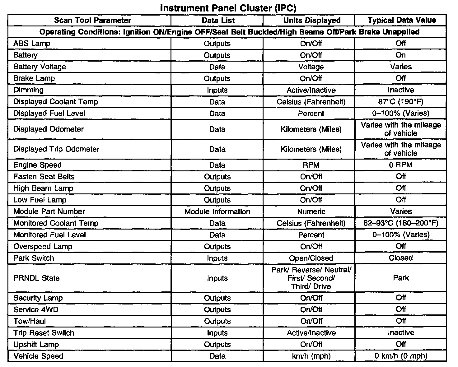 Scan Tool Data List - Instrument Panel Cluster (IPC)