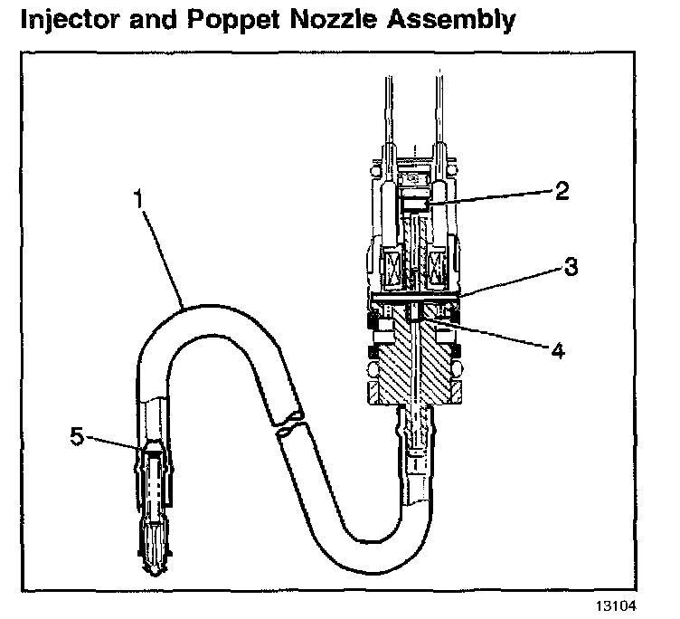 Each fuel injector assembly is a solenoid-operated device, controlled by the control module. The fuel injector assembly meters the pressurized fuel through a poppet nozzle valve (5) to a single engine cylinder. The control module energizes the flow control solenoid (2), which opens an armature valve (3), allowing fuel to flow past the valve and through a flexible fuel pipe (1) to the poppet nozzle valve. An increase in fuel pressure causes the poppet nozzle ball to open from a seat against the extension spring force. This allows the fuel to flow from the nozzle.