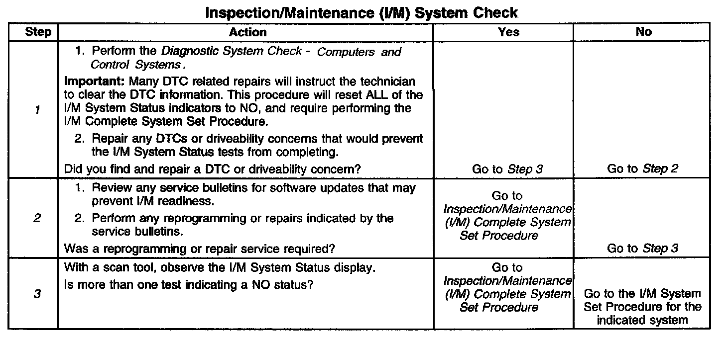 1. Any DTCs set, even those that are not listed in the Inspection/Maintenance System DTC Table, may prevent the required DTCs from running. If there is any question as to whether a set DTC is disabling the required I/M diagnostic, review the Conditions for Running in the diagnostic procedures for the DTC required by the I/M diagnostic. A list of disabling DTCs, if applicable, is contained in the supporting text for that DTC.