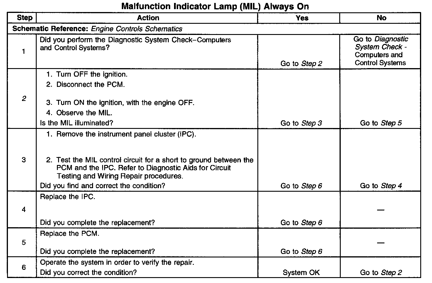 2. This step determines if the condition is with the MIL control circuit or the PCM.
