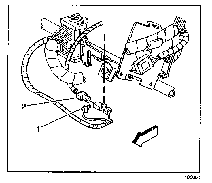 5. Disconnect the inflatable restraint steering wheel module connector (2) located next to the steering column.