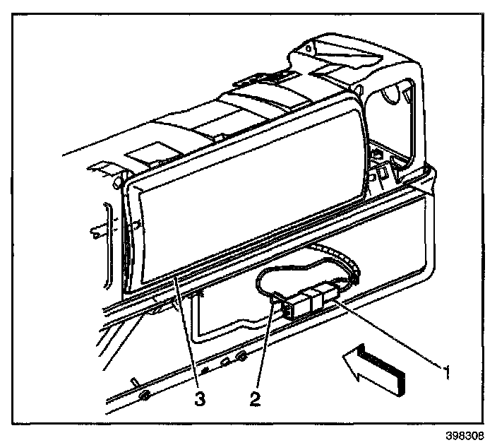 23. Disconnect the inflatable restraint IP module connector (1) located behind the glove box (3).