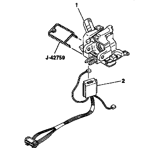4. Insert J 42759 into the electronic lock module assembly (1) and slide the ignition and key alarm switch assembly (2) out.