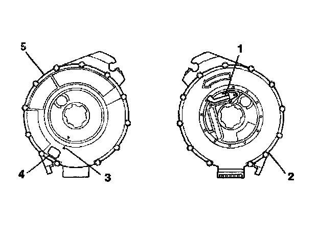 2. If the front (5) of the inflatable restraint steering wheel module coil has a centering window (4), and on the back side (2) a spring service lock (1), perform the following steps: