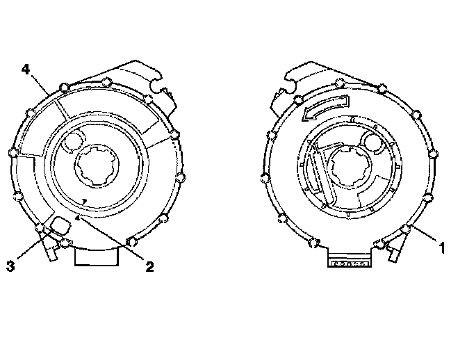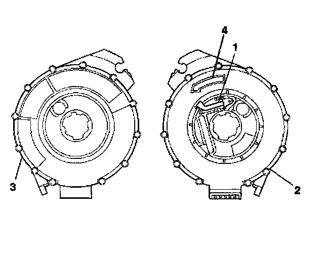 3. If the front (4) of the inflatable restraint steering wheel module coil has a centering window (3) and no spring service lock on the back side (1), perform the following steps: