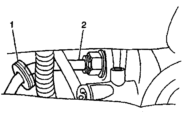 6. Remove the oil cooler lines from the radiator. On vehicles equipped with a 4.3L engine and 4WD, it may be necessary to gain access to the lower cooler line (2) through the right side wheel well opening.